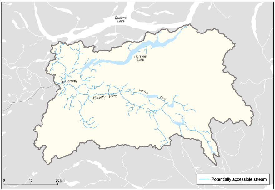 The geographic scope of this WCRP was further refined by identifying naturally accessible waterbodies, which are defined as waterbodies that focal species should be able to access in the absence of human-made barriers (Figure 1.2). Naturally accessible waterbodies were spatially delineated using fish species observation and distribution data, as well as data on “natural barriers”. These include waterfalls greater than 5 m in height, gradient barriers based on literatrure-derived species-specific swimming abilities, and areas of subsurface flow. These maps were explored by the planning team to incorporate additional local knowledge, ensure accuracy, and finalize the constraints on naturally accessible waterbodies. The planning team identified certain tributaries to the mainstem Horsefly River as “watershed exclusion areas”, which were excluded from further consideration under this plan due to intermittent or insufficient flows to support restoring connectivity for the focal species. The geographic scope was further refined based on several confirmed impassable waterfalls and modelled gradient barriers. Specifically, there are two impassable waterfalls that severely limit natural accessibility: one on the mainstem Horsefly River approximately 4 km upstream of the confluence with McKinley Creek, and the second on Moffat Creek approximately 5 km upstream from where it flows into the Horsefly River. All waterbodies not identified as naturally accessible were removed from the scope for further consideration. The naturally accessible waterbodies formed the foundation for all subsequent analyses and planning steps, including mapping and modelling useable habitat types, quantifying the current connectivity status, goal setting, and action planning (Mazany-Wright et al. (2021a)).