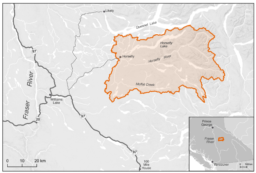 The primary geographic scope of this WCRP is the Horsefly River watershed, located in the upper Fraser River drainage basin in central British Columbia (Figure 1.1). The scope constitutes the Horsefly River “watershed group” as defined by the British Columbia Freshwater Atlas (FWA). A consistent spatial framework was necessary to undertake a watershed selection process at the provincial scale to identify target watersheds to improve connectivity for salmon. The Horsefly River watershed was identified by the B.C. Fish Passage Restoration Initiative as one of four target watersheds for WCRP development (Mazany-Wright et al. (2021b)). The Horsefly River watershed has a drainage area of 276,603 ha, spanning from the Quesnel Highlands in the southeast to the confluence with Quesnel Lake in the northwest. Culturally and economically important populations of Chinook Salmon, Coho Salmon, and Sockeye Salmon are all found in the watershed, which historically supported Indigenous sustenance and trading economies (W. L. F. Nation. (2021), X. F. Nation. (2021)).